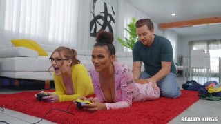 When Kyle Mason returns from folding Alina Ali's laundry, he finds his girlfriend, Aria Kai, making out with and fingering Alina through her enticing onesie butt flap, while they play video games. Kyle is heartbroken until Alina invites him to take her open butt flap for a spin with his hard cock. Free-use sex ensues between Kyle and Alina, until Aria realizes she's been left out and demands Kyle fuck her hard as well. Eventually, gaming gets set aside for a full-on, intense threesome, which leaves everyone satisfied. But after all that, who's going to deal with the pile of laundry? - ''No Need To Fap With A Butt Flap: Part 2'' #rkprime #realitykings