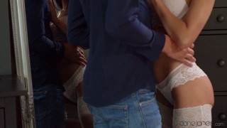 Having just received an online order of fresh and sultry white lingerie, Nikki Fox admires how good the outfit makes her tits and ass look. Nikki's lover Nick comes into the room and takes a moment to drink in the beauty of the stunner wearing stockings before taking her into his arms. Nick kisses Nikki with passion, and the lovely brunette sits on his lap on the bed. As she plays with her own boobs, Nick slides his hand down the front of Nikki's lacy lingerie and teases her pussy. He then lies her back and eats her out until she is dripping wet. Nikki makes Nick's dick wet with a blowjob, then the stud pleasures her pussy. After pounding her until she cums, Nick pulls out of Nikki in doggystyle so he can cum on her booty! - ''Sweet love making in white lingerie'' #danejones #sexyhub